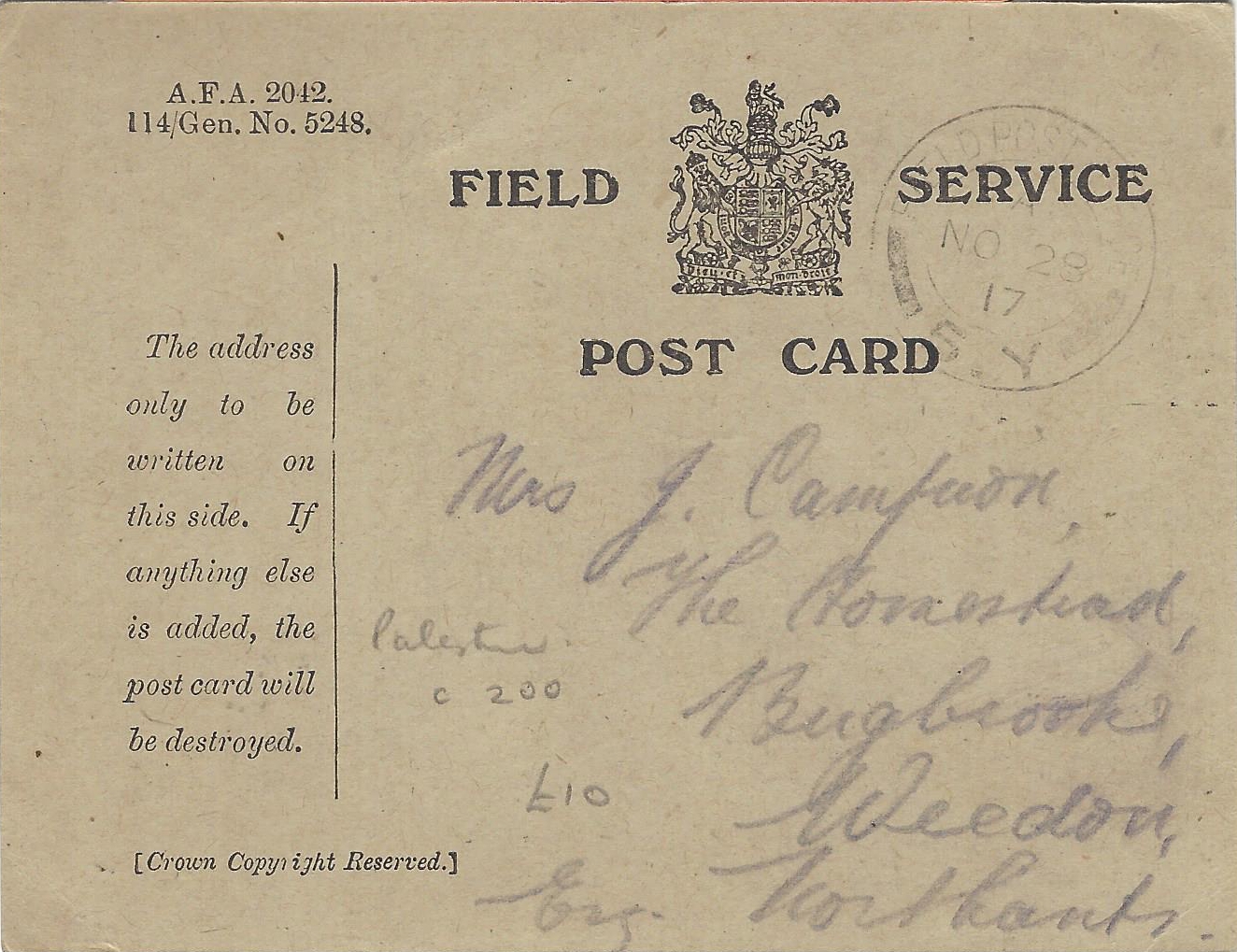 הצורך של החיילים לשמור על קשר עם בני משפחותיהם בזמן מלחמה העמיד לא אחת אתגר קשה בפני שלטונות הצבא. קבלה ומשלוח של דברי דואר הוכרו כאמצעי ראשון במעלה לשמירה על מורל הלוחמים, ונעשו מאמצים גדולים להבטיח את רציפות פעולתו של הדואר הצבאי. בתקופת מלחמת העולם הראשונה התמודדו שלטונות הצבא לראשונה עם הצורך להעביר מיליוני דברי דואר לכל רחבי העולם, ואחד הפתרונות שמצאו היה פיתוח של גלויה מיוחדת ובה מסרים קצרים, מודפסים מראש, מהם יכול היה החייל לבחור את המסר המתאים לו. מספר גלויות השמורות באוסף אלכסנדר מייצגות מסרים שהעבירו חיילי הצבא הבריטי מחזית ארץ ישראל.