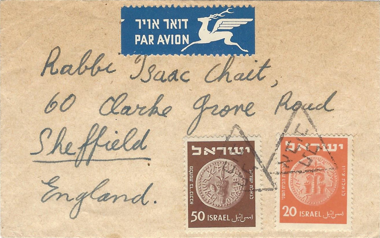 מעטפה השמורה באוסף אלכסנדר נשלחה במועד לא ידוע מישראל לאנגליה. שורה של רמזים אותם ניתן למצוא על המעטפה מאפשרים לשער את מועד המשלוח ואת התכולה של המעטפה.