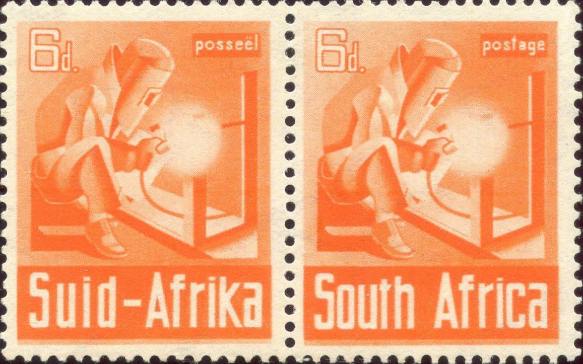 Two stamps of the same design, each with an inscription in a different language. Between 1926 and 1951, most South African stamps were issued in bilingual pairs, with one stamp printed in English and the other in Afrikaans.