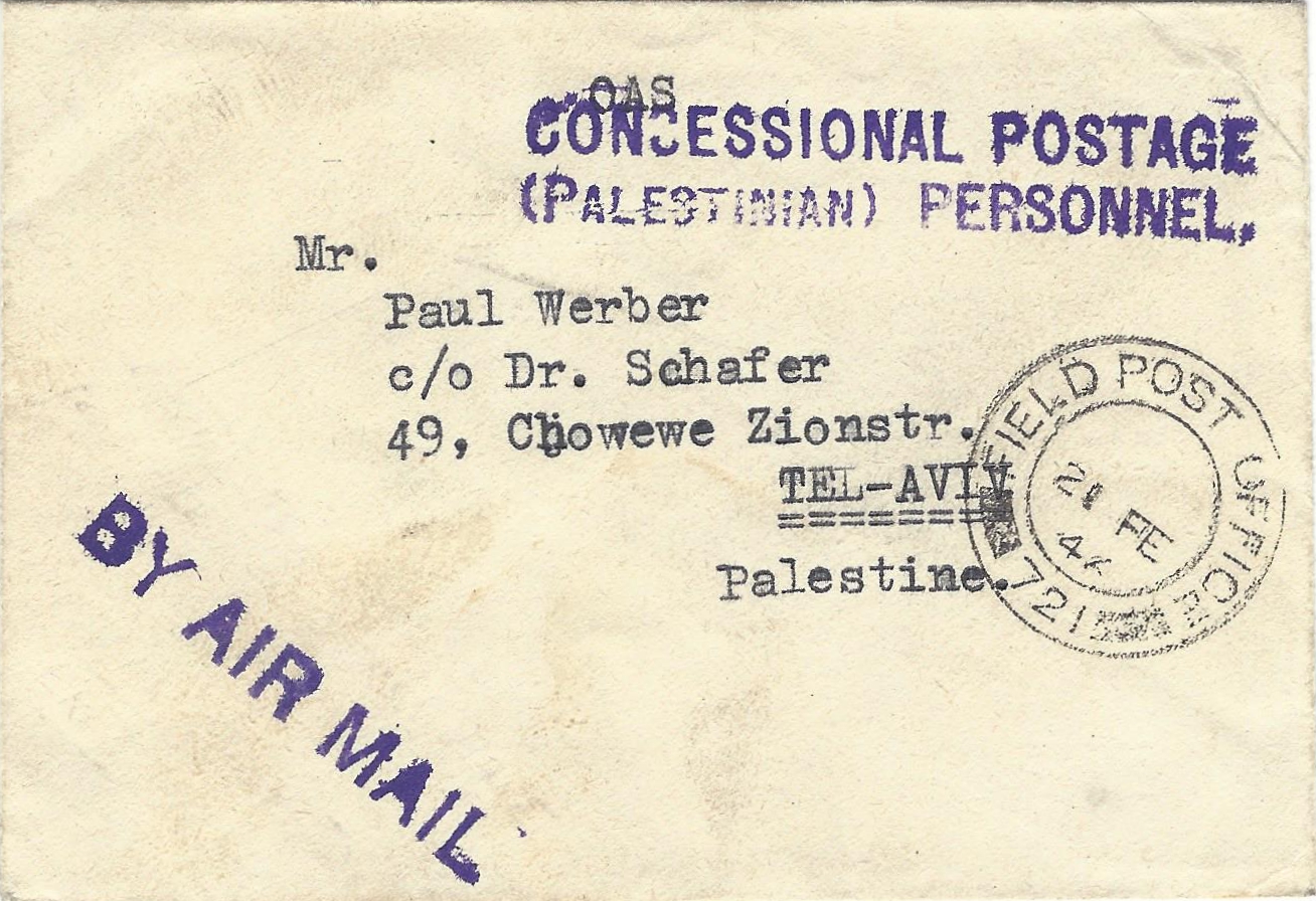 In 1945, a special order was issued which gave the soldiers of the Jewish Brigade who served in Italy a special benefit in sending letters to the Land of Israel. This was a unique benefit that was personally granted only to soldiers whose permanent place of residence was the Land of Israel. Two letters preserved in the Alexander collection serve as evidence of how this benefit was exercised in order to send letters to Israel.