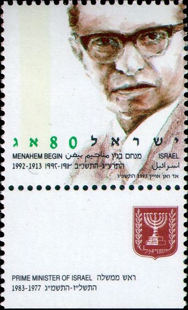 On February 16, 1993, Israel Post issued a stamp dedicated to Israeli Prime Minister Menachem Begin, a year after his death.