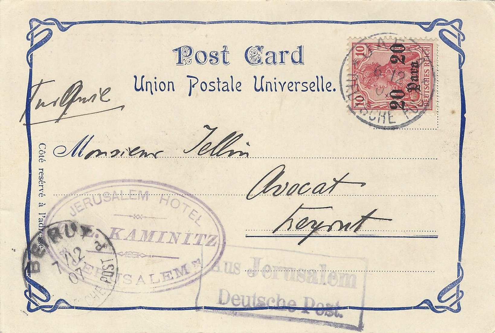 The German post office that operated in Israel in the period before the First World War was considered a reliable and orderly organization, working efficiently for the benefit of its customers. The German Post has initiated activities designed to shorten the time of delivery of postal items, such as establishing points for delivering letters outside the post offices. The postmarks stamped on a postcard kept in the Alexander collection testify to the operation of the German post office.