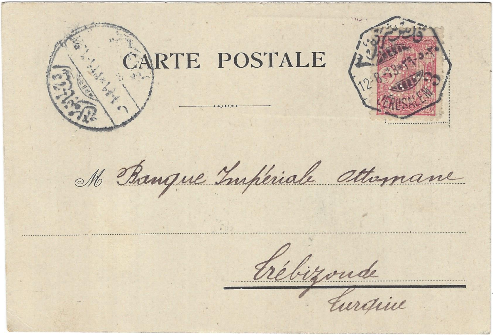 On August 12, 1913, Credit Leona Bank sent a business postcard to one of its customers in the city of Trabzon in northeastern Turkey. A stamp was affixed to the postcard with a Perfin of the initials of the bank, a measure against petty theft by the company’s employees. This is one of the only known copies of the Perfined stamp that survived on a postal item.