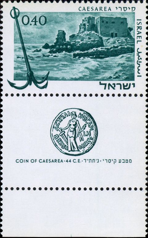 On March 22, 1967, Israel Post issued a stamp dedicated to the ancient port of Caesarea. An ancient coin that was issued in the place under the Roman rule was incorporated into the Tab of the stamp.